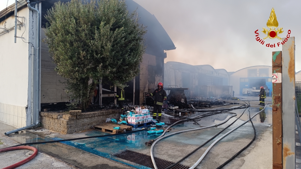Monteforte Irpino – Vasto incendio in un deposito di detersivi: intervento dei Vigili del Fuoco e dei Carabinieri. Foto