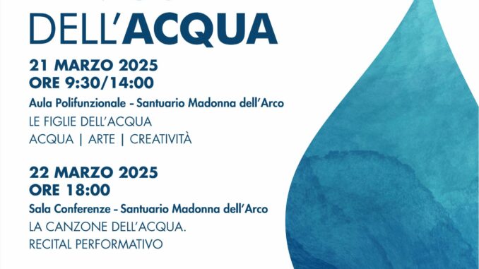 21 marzo – Giornata di sensibilizzazione e premi – La Sala Polifunzionale del Santuario di Madonna dell’Arco ospiterà, a partire dalle ore 9:00, l’esposizione dell’installazione artistica collettiva “Le figlie dell’Acqua 2025”, realizzata dagli studenti dei Licei Artistici della Campania. L’esposizione sarà visitabile fino al 23 marzo e rappresenta una metafora visibile di come ciascuno possa fare la propria parte per la protezione dell’acqua.