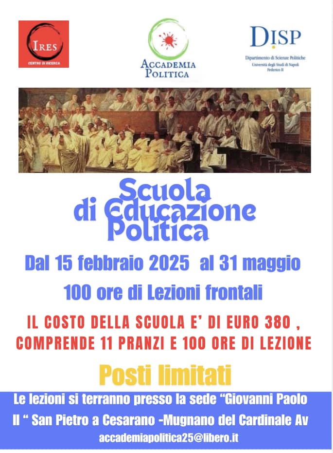Sono ufficialmente aperte le iscrizioni per la Scuola di Educazione Politica, un percorso formativo promosso dall’Accademia Politica in collaborazione con il Centro di Ricerca IRES e il Dipartimento di Scienze Politiche dell’Università degli Studi di Napoli Federico II. La scuola prenderà il via il 15 febbraio 2025 e si concluderà il 31 maggio 2025, con un programma di 100 ore di lezioni frontali dedicate alla formazione politica e civica.