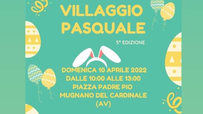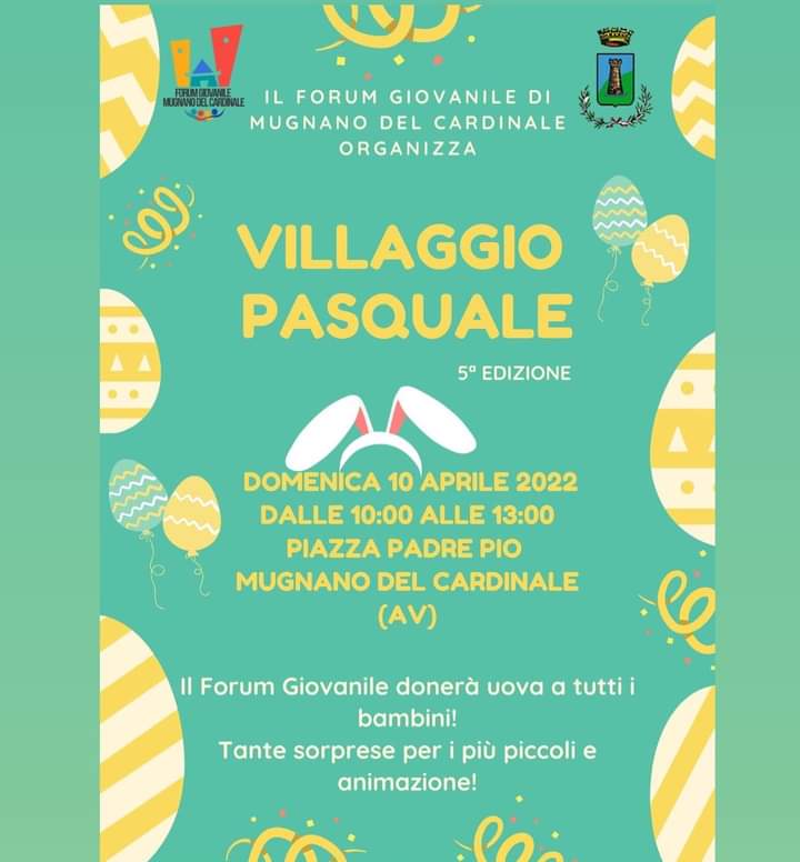 Domenica 10 aprile, in piazza Padre Pio, si terrà la V edizione del “Villaggio Pasquale” organizzato dal Forum Giovanile. A tutti i bambini sarà donato un uovo, ci saranno tante sorprese per i più piccoli e animazione.Mugnano del Cardinale (AV)   Villaggio Pasquale domenica 10 aprile