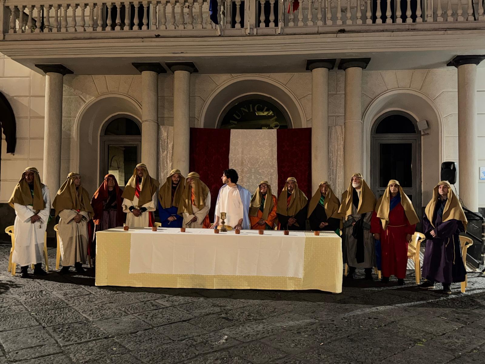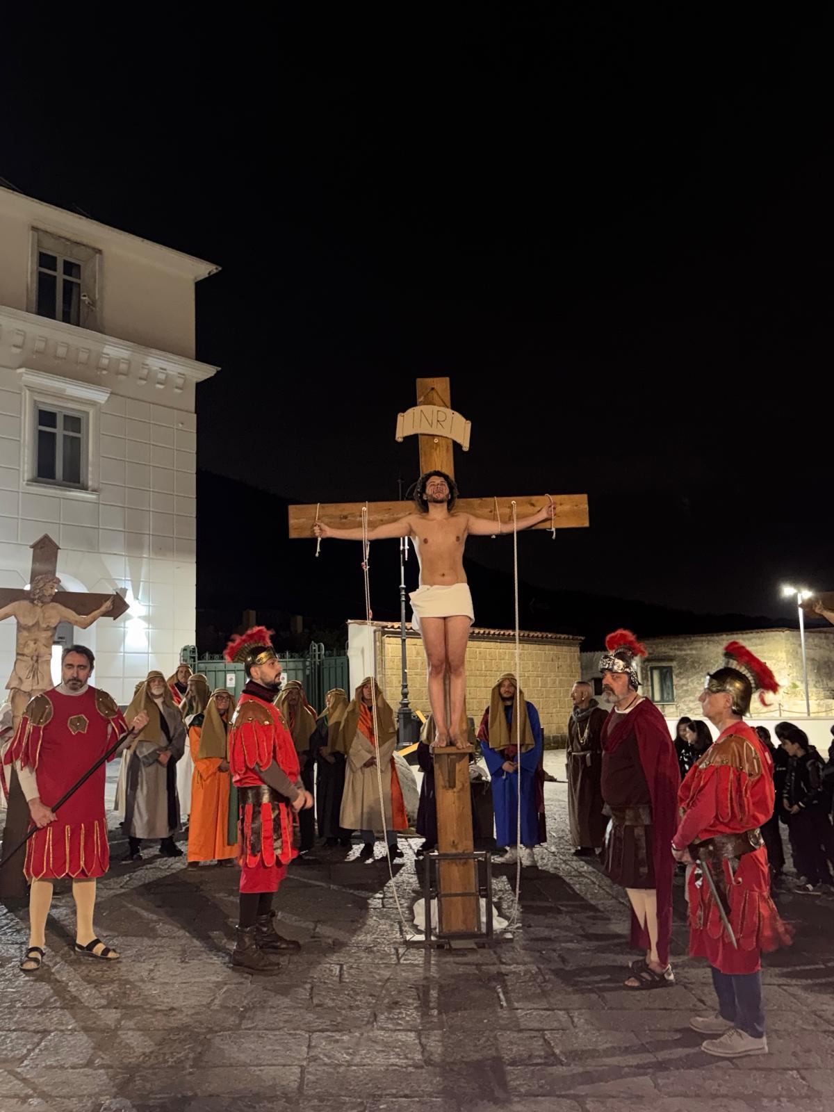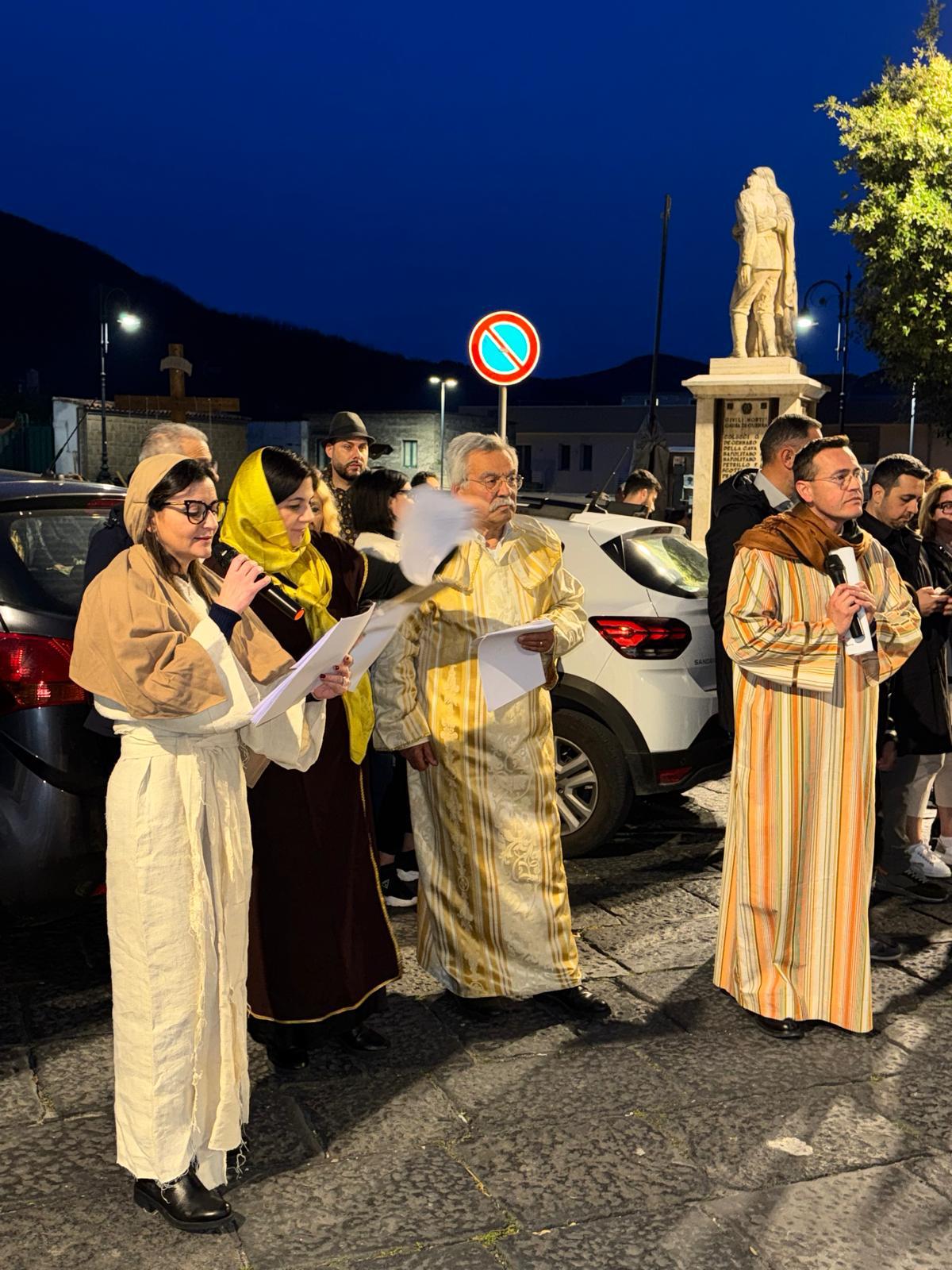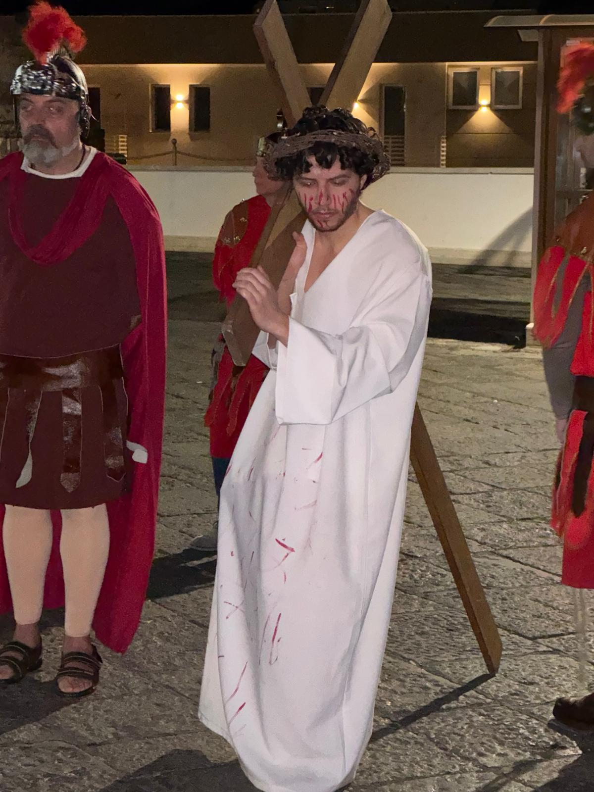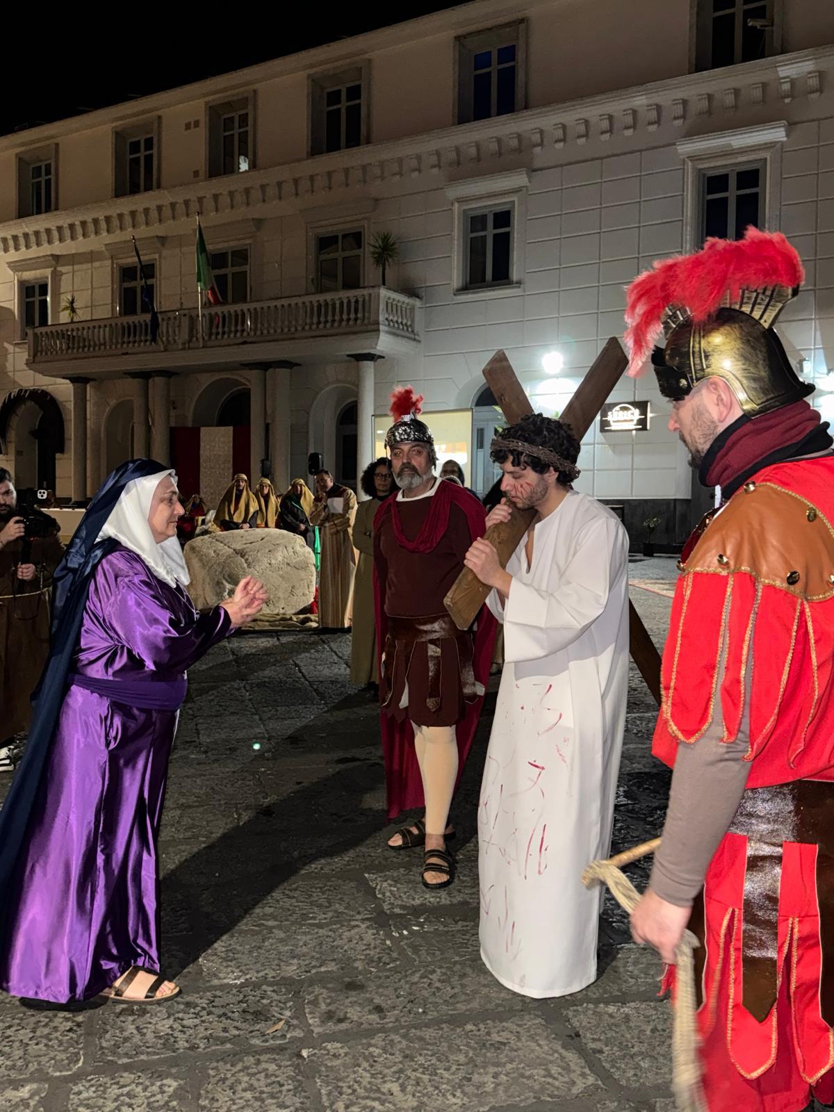 La piazza si è trasformata in un vero teatro a cielo aperto, dove le stazioni della Passione di Cristo sono state rappresentate attraverso quadri viventi, letture evangeliche e musiche sacre che hanno guidato i fedeli lungo il percorso simbolico del Calvario. Ogni scena, curata nei minimi dettagli, ha saputo toccare le corde dell’anima, emozionando i presenti e rendendo viva la memoria del sacrificio di Cristo.