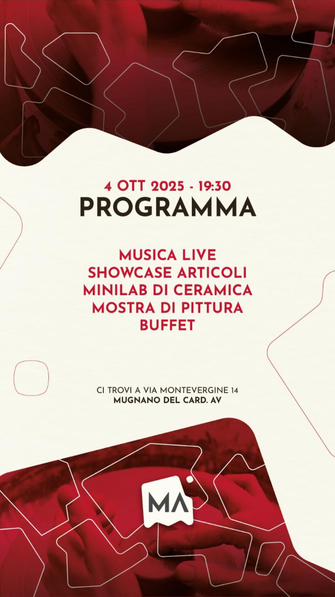 MUGNANO DEL CARDINALE (AV) – Sabato 4 ottobre 2025, alle ore 19:30, in via Montevergine 14 a Mugnano del Cardinale, si alzerà ufficialmente il sipario su “Materia”, nuovo spazio dedicato alla pittura e alla ceramica.