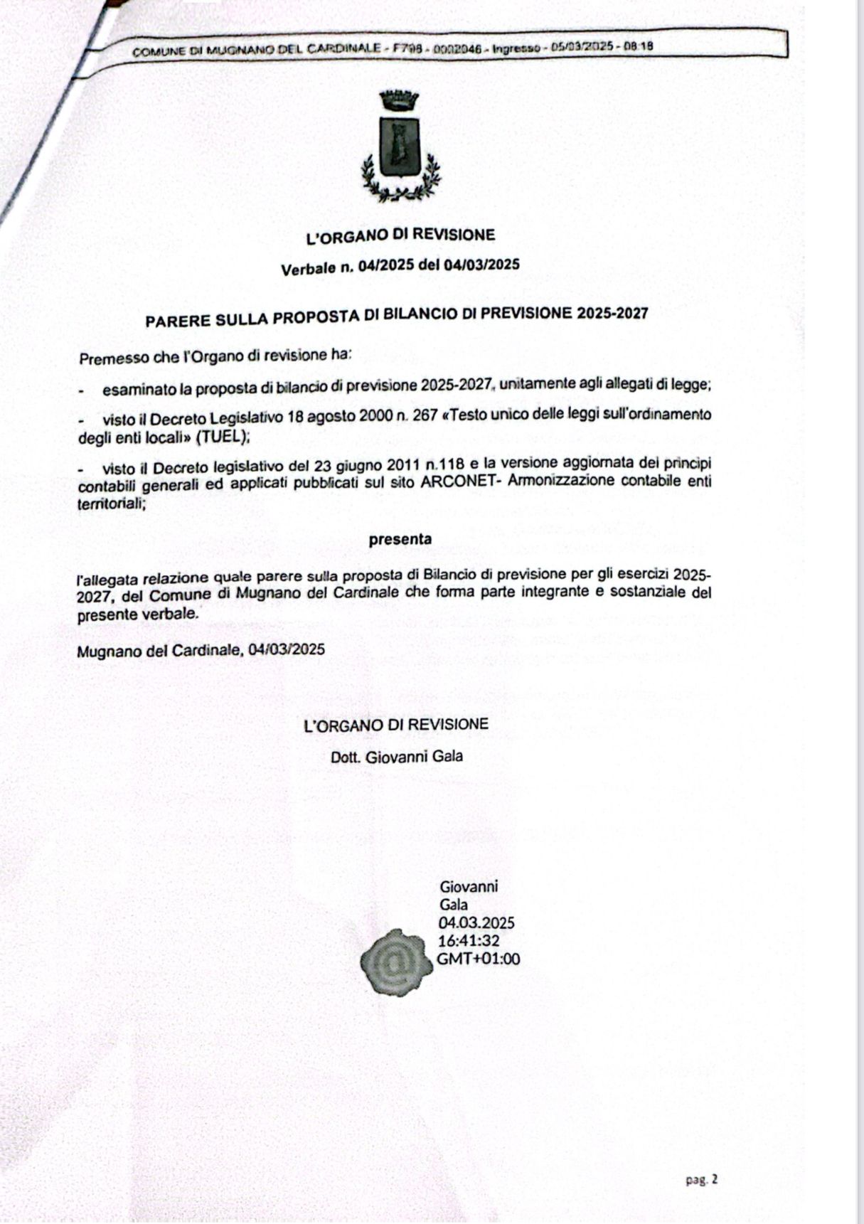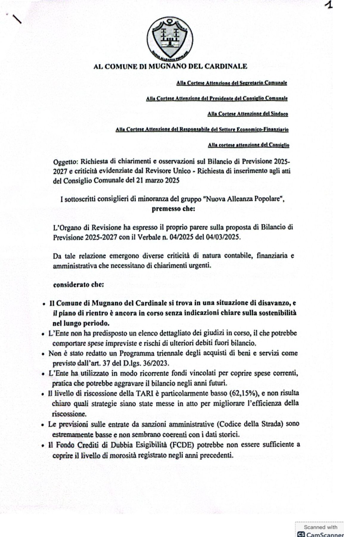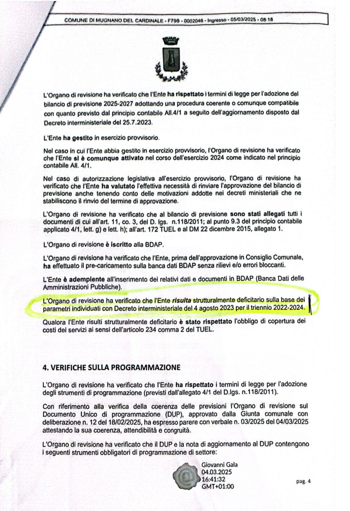 Il Comune di Mugnano del Cardinale, come certificato dal Revisore dei Conti DOTT. GIOVANNI GALA, nel parere sul Bilancio 2025-2027, è ufficialmente in disavanzo, con una situazione finanziaria che desta seria preoccupazione.