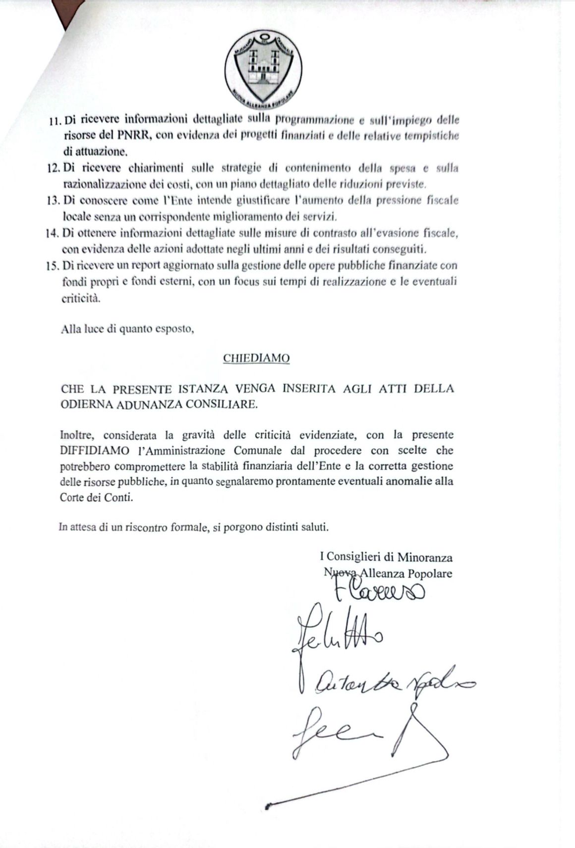 Ed ancora, circa l’ istanza degli atti non avuti, questi esulano dai documenti del Consiglio REGOLARMENTE RICEVUTI, ma sono atti prodromici per l’ analisi e lo screening del bilancio 2025-2027 e del D.U.P. ( DOCUMENTO UNICO DI PROGRAMMAZIONE) diverso dalle linee programmatiche.