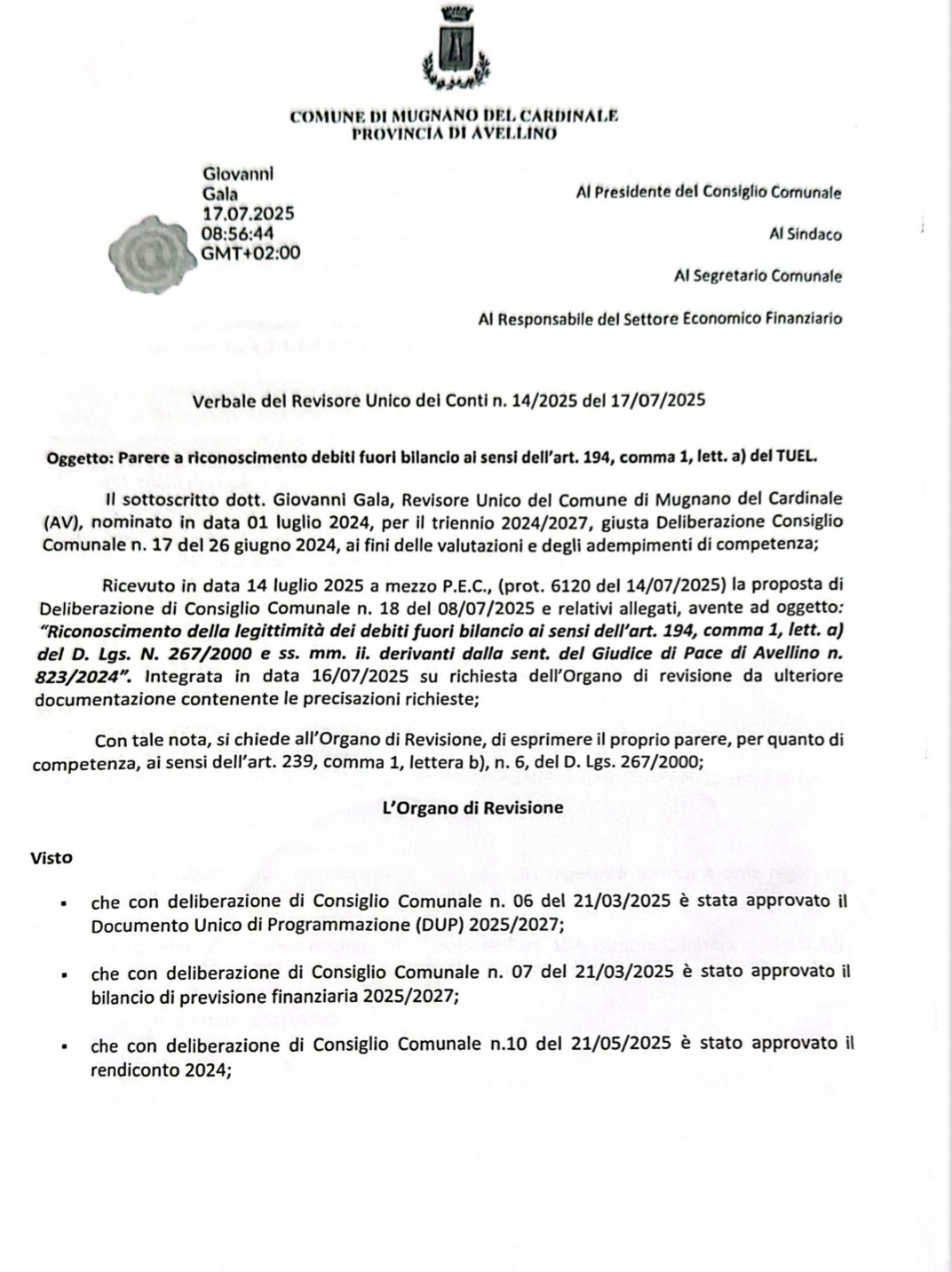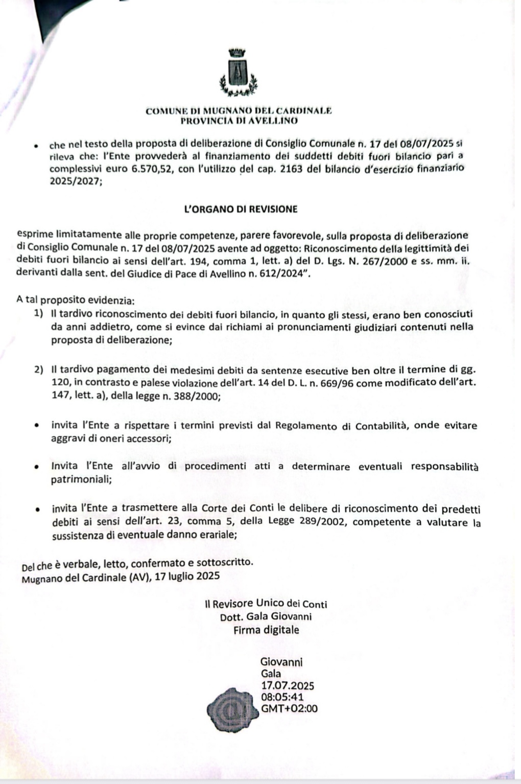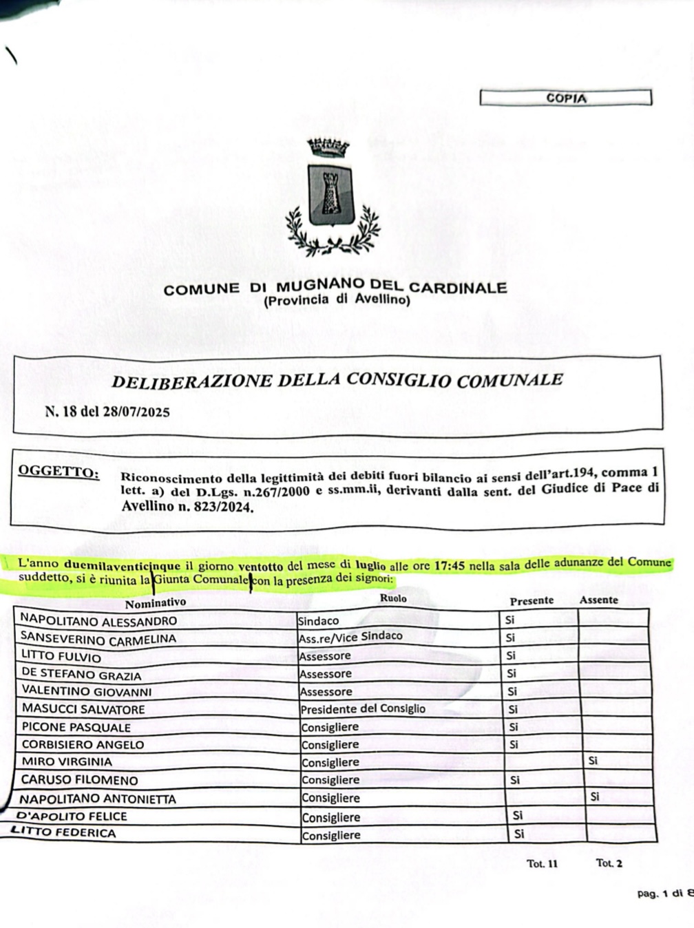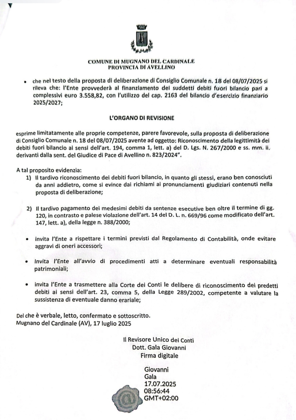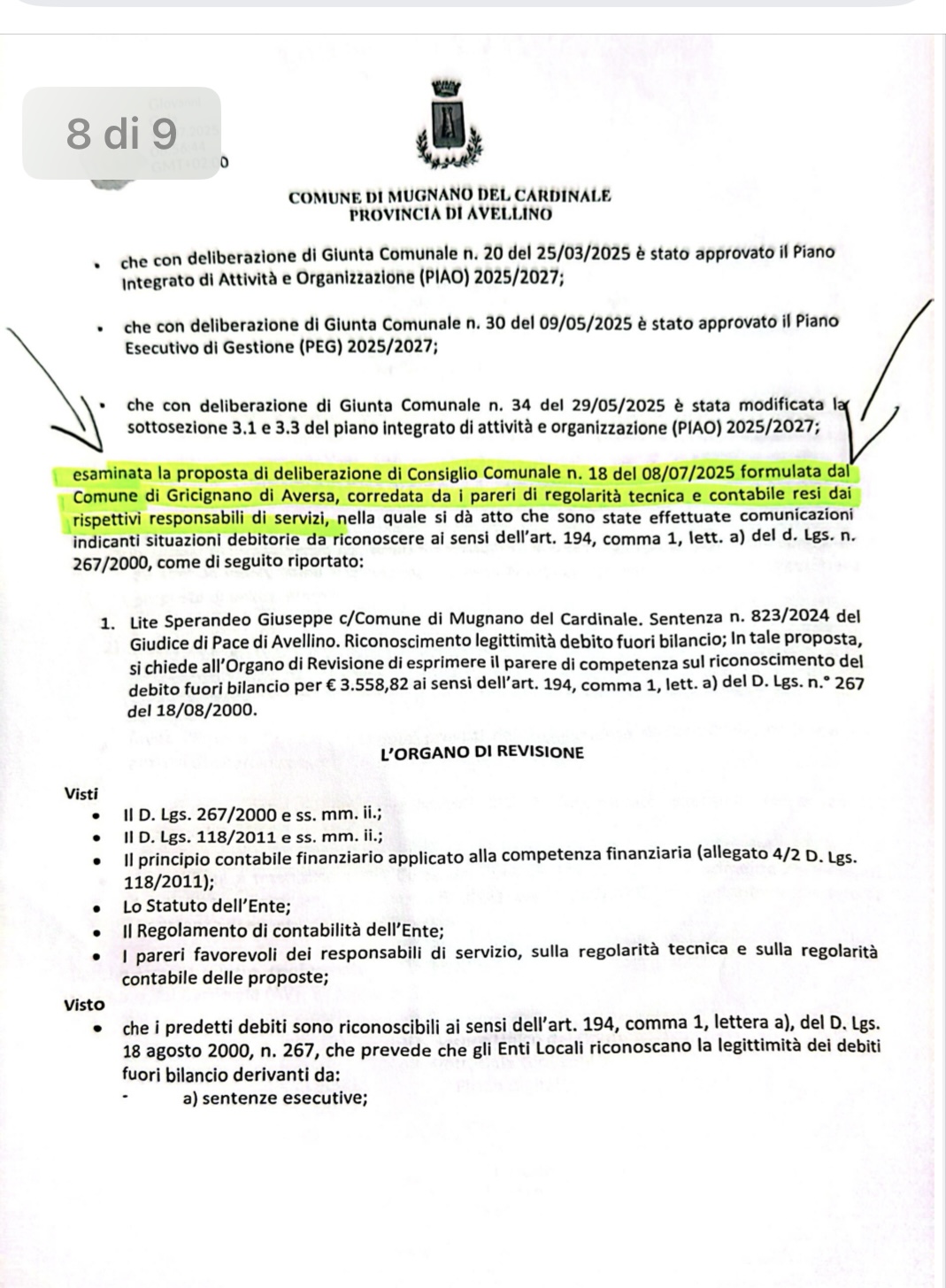 Ma c’è di più, tra gli atti caricati come “atti del Consiglio comunale”, compariva in realtà” si è riunita la Giunta Comunale”, travisando completamente la natura delle fonti normative e generando confusione tra atti amministrativi di natura e valore giuridico differenti. Un fatto gravissimo, che mina la trasparenza dell’albo pretorio e configura un abuso nella gestione documentale, e come se non bastasse: Il parere del Revisore dei Conti sui debiti fuori bilancio riportava, nero su bianco, un richiamo al Comune di Gricignano di Aversa. Un copia-incolla sconcertante, frutto di pressapochismo istituzionale e di una totale assenza di controllo.