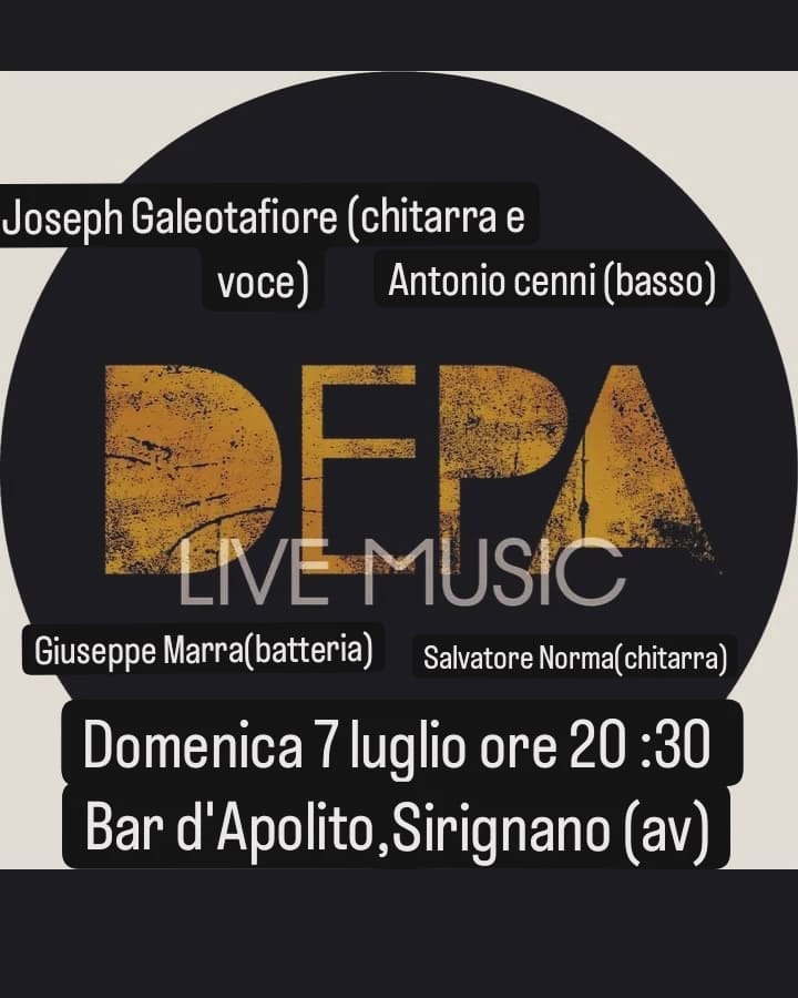 La band dei DEPA vi aspetta domenica 7 luglio alle ore 20:30 al Bar d’Apolito per una serata indimenticabile.