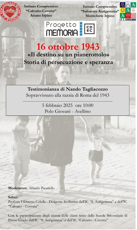 Porterà la sua testimonianza agli studenti dell’IC Aurigemma di Monteforte e dell’IC Calvario-Covotta di Ariano l’ingegnere Nando Tagliacozzo, tra i sopravvissuti al rastrellamento del ghetto di Roma nell’ottobre del 1943. Il 5 febbraio, alle 10, sarà ospite al Paolo Giovani di Avellino, di un incontro dal titolo “16 ottobre 1943. “Il destino su un pianerottolo”: storia di persecuzione e speranza”. Condividerà con gli alunni dei due istituti irpini, guidati dalla dirigente Filomena Colella, la sua esperienza, punto d’incontro tra la storia documentata e la memoria vissuta di chi ha subìto le discriminazioni imposte dal regime fascista. A partecipare all’incontro anche la professoressa Lori Cohen, membro della comunità ebraica di Napoli. Introdurrà l’incontro la dirigente scolastica Filomena Colella.