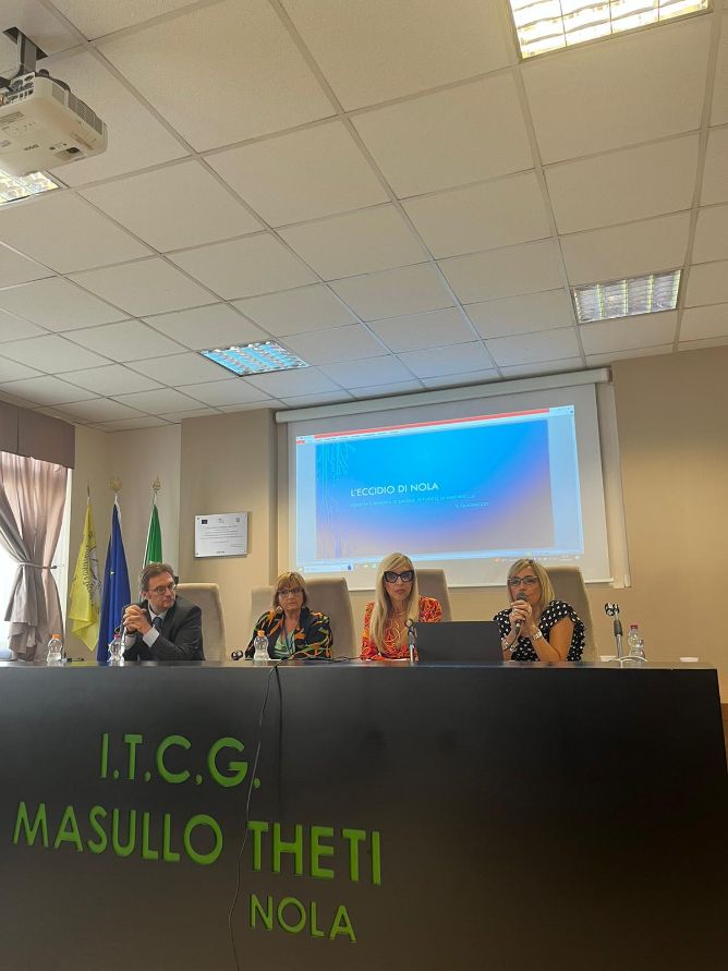 Al convegno, che si è svolto nella sala conferenze “Francesco Vecchione”, hanno partecipato sei classi quinte, mentre le restanti sei hanno seguito l’evento dalle proprie aule in diretta You Tube. Presente la Dirigente Elisa De Luca, il sindaco di Nola dott. Carlo Buonauro, e le docenti Titti Falco e Susy Barone che ha moderato l’incontro.