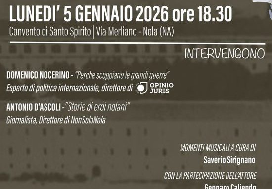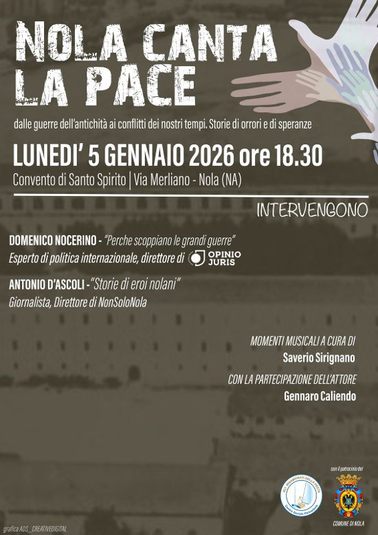 “E’ importante che anche livello locale ci siano momenti ed occasioni per approfondire temi internazionali – afferma Antonio D’Ascoli, presidente dell’associazione Gli Innamorati della Festa e direttore del quotidiano on line nonsolonola.it – già sul nostro giornale ufficiale on line abbiamo trattato alcune vicende come la questione dei dazi e dell’impatto sulla nostra quotidianità, grazie al contributo qualificato del professor Carmine Soprano con il quale continueremo questo tipo di rubriche. Con il collega Domenico Nocerino, esperto di politica internazionale e direttore di una rivista specializzata, proveremo a chiarire sul piano storico alcune delle motivazioni che portano alle guerre, in particolare le motivazioni dei conflitti ancora in corso che si trascinano da anni. Lo faremo in maniera divulgativa ma rigorosa, nel format di un salotto culturale, con momenti dedicati a brani musicali dedicati alla pace e curati da Saverio Sirignano, e la lettura di testi e fonti emblematiche e significative, con il contributo dell’attore Gennaro Caliendo”.