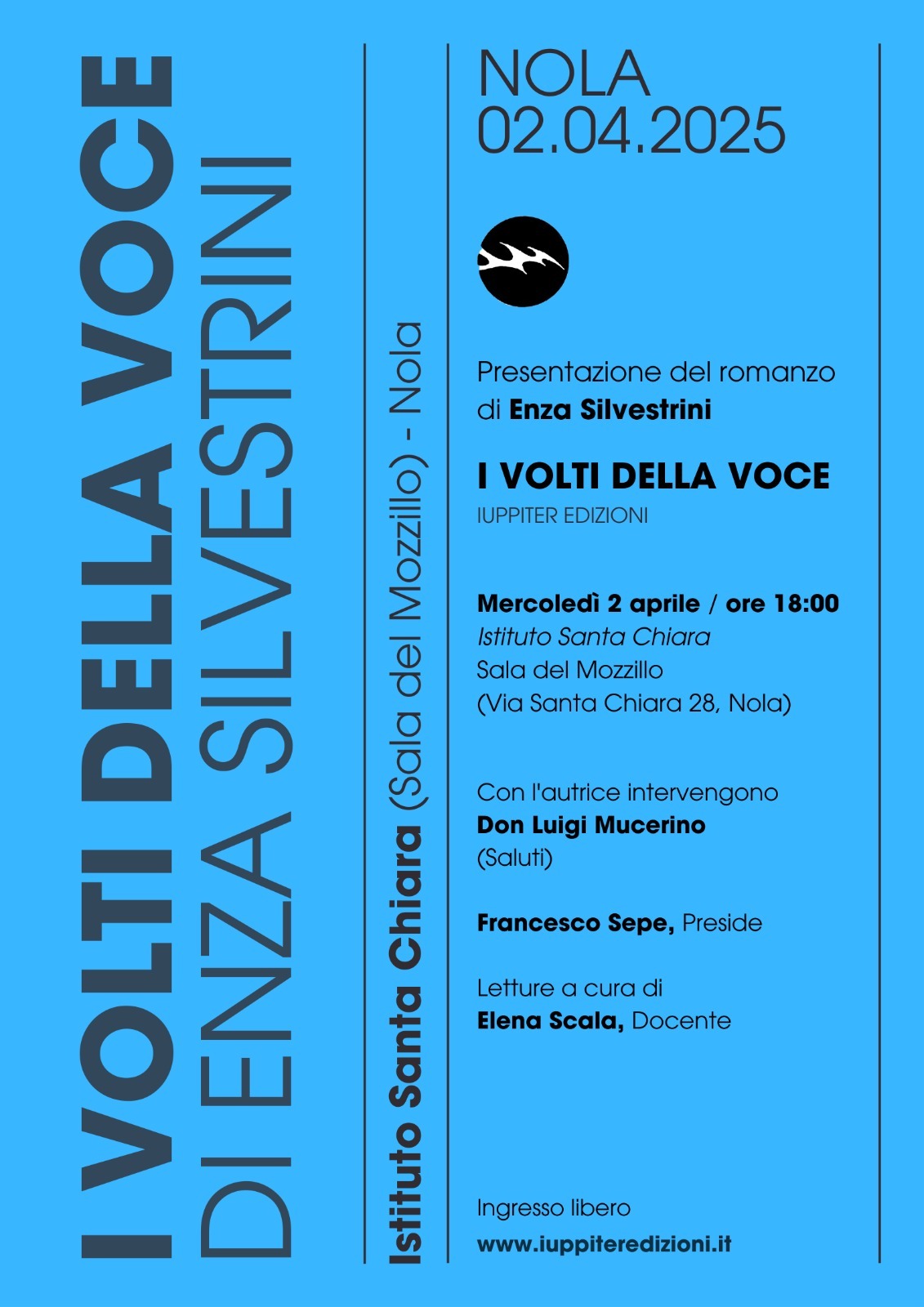 Mercoledì 2 aprile alle ore 18.00, nella sala del Mozzillo dell’Istituto Santa Chiara a Nola, si terrà la presentazione del nuovo romanzo di Enza Silvestrini, I volti della voce, edito da Iuppiter Edizioni. Un evento che si preannuncia come un’importante occasione di confronto culturale e letterario, arricchito da interventi di spessore.