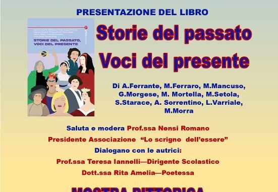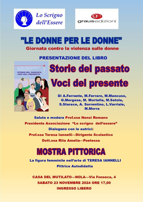 Nola- 23 novembre alle ore 17:00 presso la Casa del Mutilato di Nola alla via Fonseca,4 ci sarà la presentazione del libro STORIE DEL PASSATO, VOCI DEL PRESENTE – Le autrici saranno ospiti dell’associazione nolana “Lo scrigno dell’essere” . “L’associazione” , dichiara la presidentessa Nensi Romano “conta molti iscritti, è molto radicata ed attiva sul territorio ed è sensibile alle tematiche sociali – Abbiamo voluto dedicare La giornata contro la violenza sulle donne invitando le autrici di questo libro che parlano di dieci donne del passato che si sono distinte nella loro epoca per le loro personalità” . Oggigiorno è ancora molto importante valorizzare tale data a causa ancora dei numerosi casi di violenza e di omicidi nei confronti del sesso femminile che si contano in Italia e nel mondo. I personaggi del libro sono ribelli, coraggiosi che ci danno l’opportunità di leggere di donne che, anche se a noi lontane nel tempo e nello spazio, ci donano esempi di resilienza e di volontà , e che soprattutto si pongono come esempio per le nuove generazioni”.