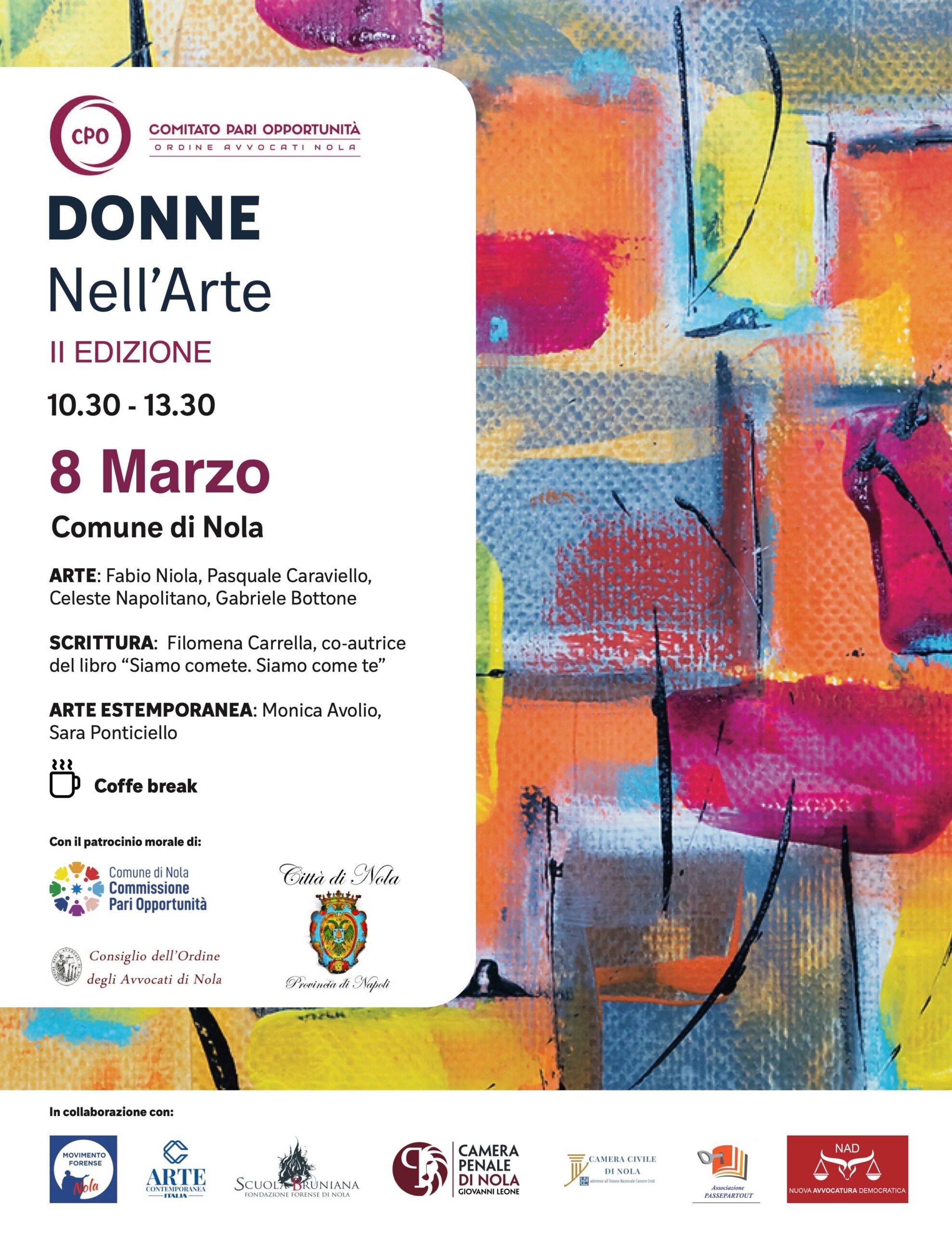 Arriva alla seconda edizione l’evento organizzato dal Comitato Pari Opportunità dell’Ordine degli avvocati di Nola dal titolo “Donne nell’arte”. Un evento partecipato da numerose associazioni giuridiche e culturali del territorio volto a celebrare la figura della donna attraverso l’arte intesa come strumento espressivo nelle sue molteplici forme. “Quest’anno non saranno esposte solo opere d’arte” afferma il Presidente l’avv. Cristina Spizuoco “ma ci sarà anche un angolo dedicato alla scrittura con la partecipazione di Filomena Carrella autrice del libro “Comete. Come te” e un angolo dedicato all’arte estemporanea con la partecipazione di due giovanissime artiste che utilizzeranno la loro arte, non solo pittorica, per rappresentare la figura della donna”