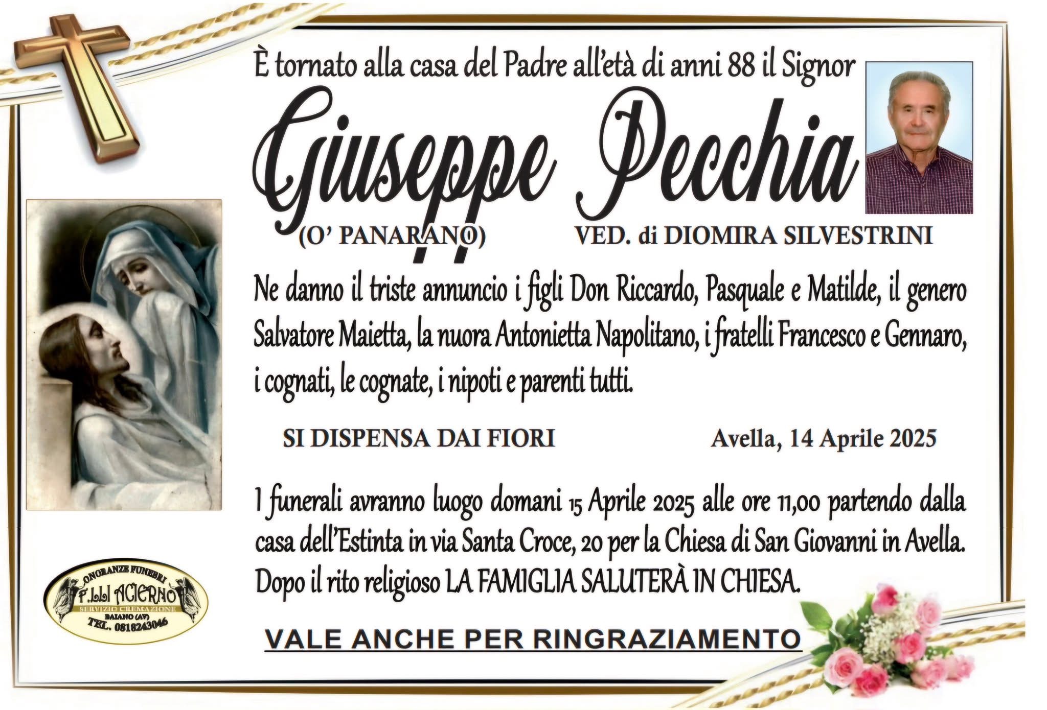 Avella – La comunità di Avella si stringe attorno alla famiglia Pecchia per la scomparsa del signor Giuseppe Pecchia, conosciuto da tutti come ’O Panarano, venuto a mancare all’età di 88 anni.