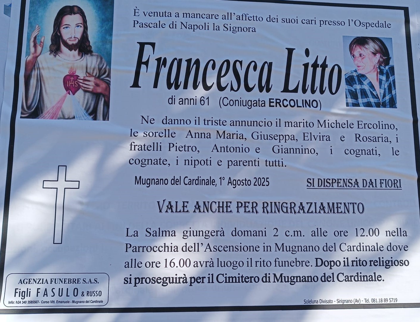 Mugnano del Cardinale, 1° agosto 2025 – La comunità di Mugnano del Cardinale piange la scomparsa di Francesca Litto, venuta a mancare all’affetto dei suoi cari presso l’Ospedale Pascale di Napoli all’età di 61 anni. La signora Litto, coniugata Ercolino, lascia nel dolore il marito Michele Ercolino, le sorelle Anna Maria, Giuseppa, Elvira e Rosaria, i fratelli Pietro, Antonio e Giannino, i cognati, le cognate, i nipoti e tutti i parenti.