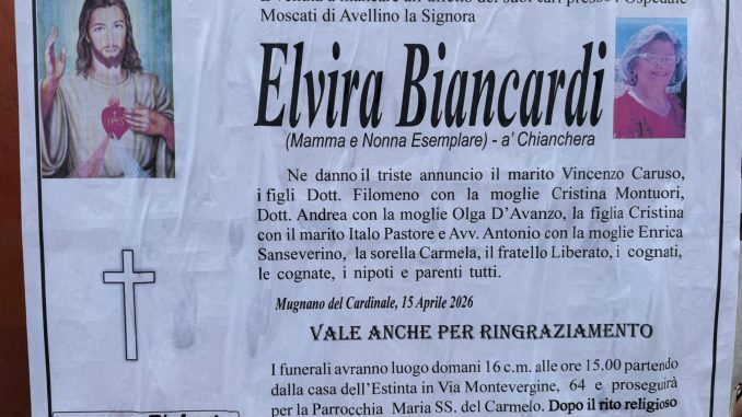 È venuta a mancare presso l’Ospedale Moscati di Avellino la signora Elvira Biancardi, conosciuta e stimata nella comunità locale. A darne il triste annuncio sono il marito Vincenzo Caruso, i figli Filomeno, Andrea, Cristina e Antonio, insieme ai familiari tutti, che ne ricordano la figura di madre e nonna.