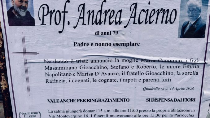È venuto a mancare all’età di 79 anni il prof. Andrea Acierno. La notizia della sua scomparsa si è diffusa nelle scorse ore nella comunità di Mugnano del Cardinale.