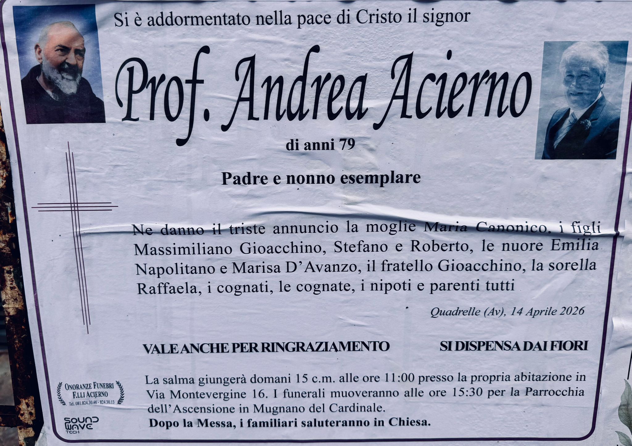 La salma giungerà nella giornata di oggi 15 aprile presso l’abitazione in via Montevergine 16. I funerali si svolgeranno alle ore 15:30 presso la Parrocchia dell’Ascensione in Mugnano del Cardinale.