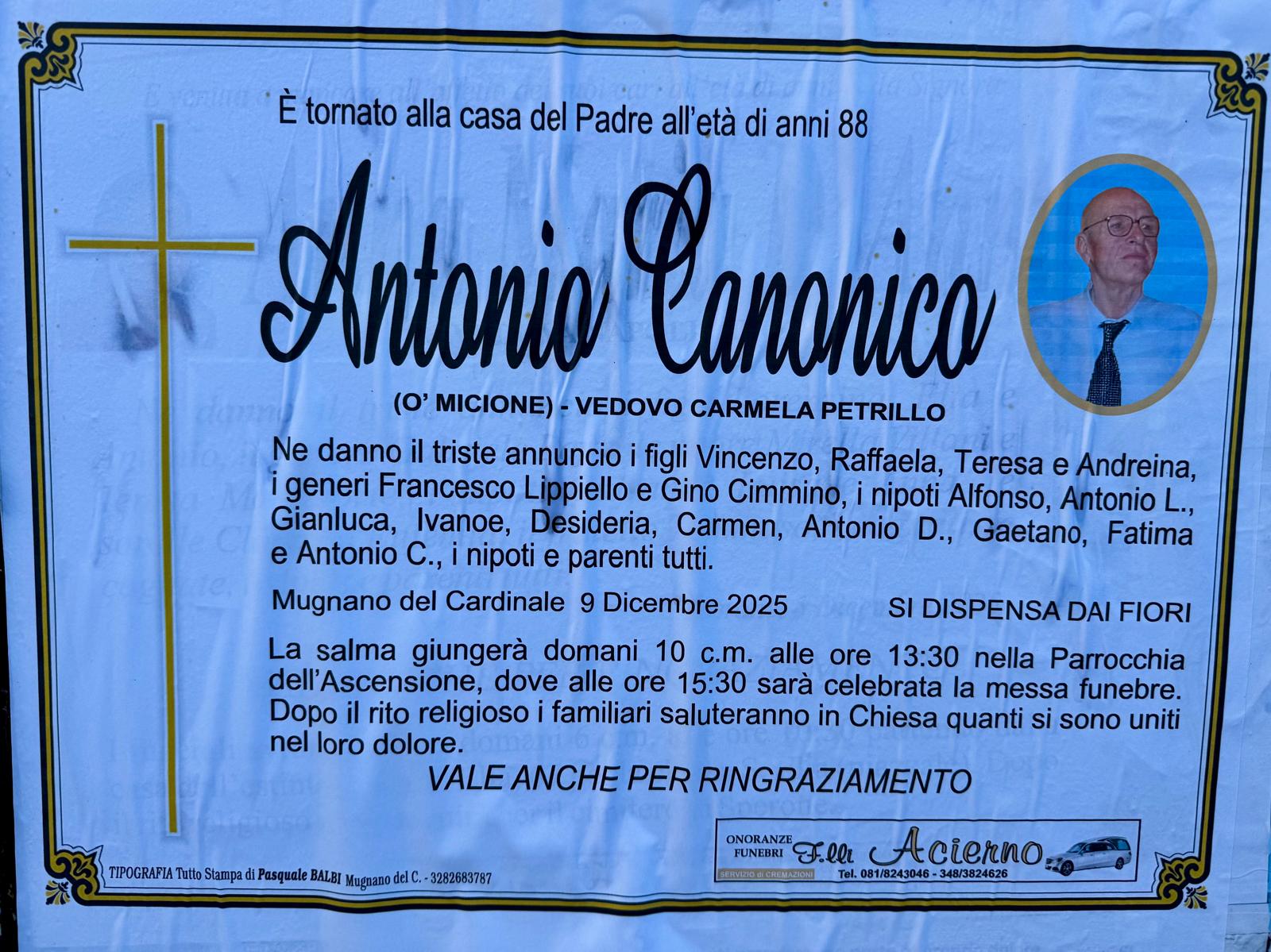 Mugnano del Cardinale si stringe attorno alla famiglia Canonico per la scomparsa di Antonio Canonico, conosciuto da tutti come “O’ Micione”, vedovo di Carmela Petrillo, tornato alla Casa del Padre all’età di 88 anni.