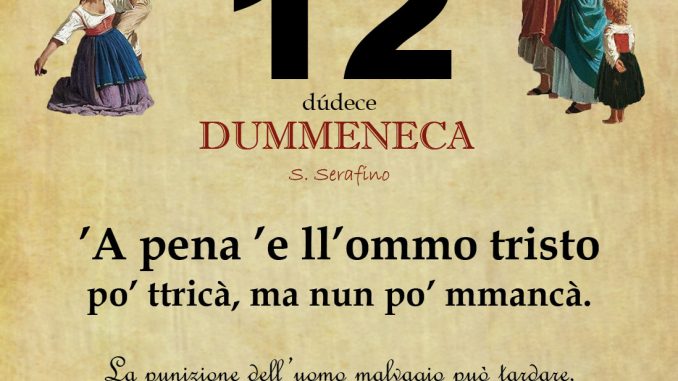 ‘O PRUVERBIO D’ ‘O JUORNO. Domenica 12 ottobre 2025 12/10/2025 binews.it EVIDENZA, Il Proverbio del Giorno 0 di Gianni Polverino’A pena ’e ll’ommo tristo po’ ttricà, ma nun po’ mmancà.La punizione dell’uomo malvagio può tardare, ma di sicuro non mancherà.