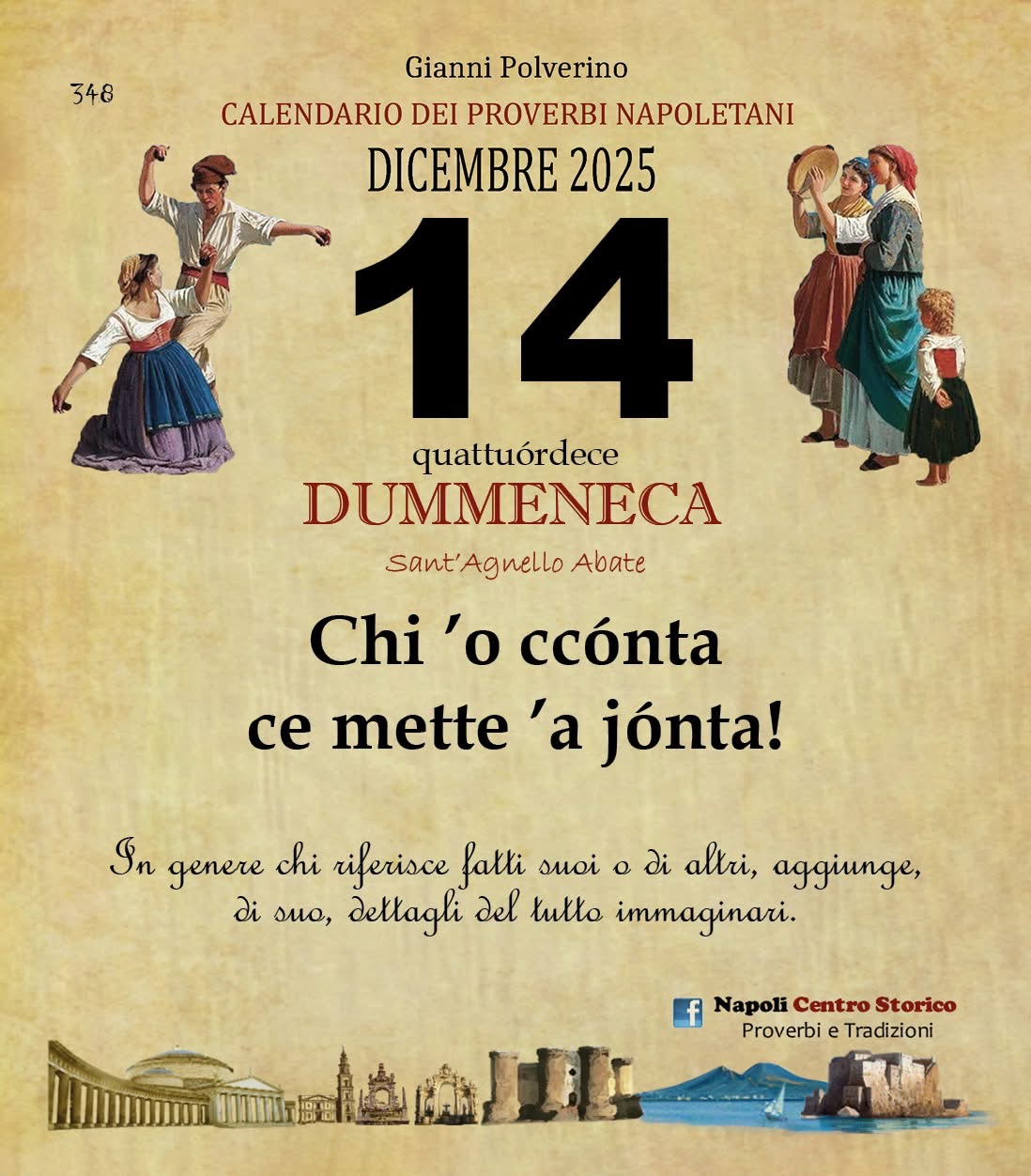 ‘O PRUVERBIO D’ ‘O JUORNO. Domenica 14 dicembre 2025 14/12/2025 binews.it EVIDENZA, Il Proverbio del Giorno 0 di Gianni PolverinoChi ’o ccónta ce mette ’a jónta! In genere chi riferisce fatti suoi o di altri, aggiunge, di suo, dettagli del tutto immaginari.