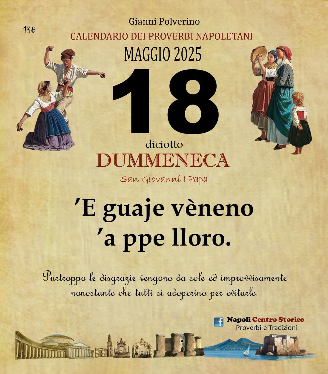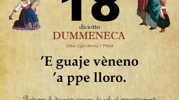 ‘O PRUVERBIO D’ ‘O JUORNO. Domenica 18 maggio 2025 18/05/2025 binews.it EVIDENZA, Il Proverbio del Giorno 0 di Gianni Polverino ’E guaje vèneno ’a ppe lloro. Purtroppo le disgrazie vengono da sole ed improvvisamente nonostante che tutti si adoperino per evitarle.