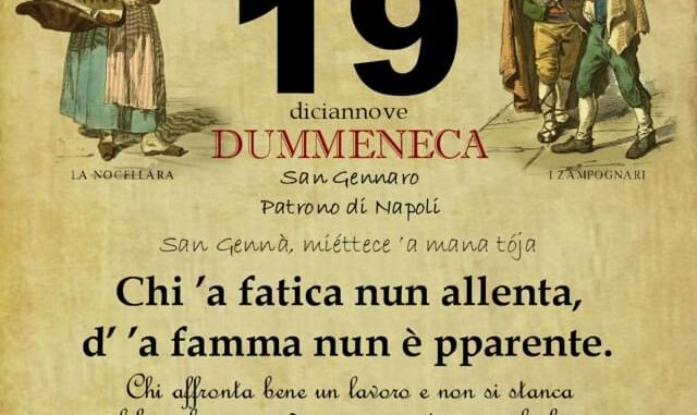 O PRUVERBIO D’ ‘O JUORNO. Domenica 19 settembre 2021 19/09/2021 binews.it EVIDENZA, Il Proverbio del Giorno 0 di Gianni Polverino Chi ’a fatica nun allenta, d’ ’a famma nun è pparente. Chi affronta bene un lavoro e non si stanca nel fare il proprio dovere non patirà mai la fame.