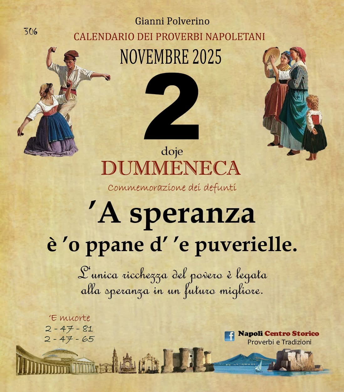 ‘O PRUVERBIO D’ ‘O JUORNO. Domenica 2 novembre 2025 02/11/2025 binews.it EVIDENZA, Il Proverbio del Giorno 0 di Gianni Polverino’A speranza è ’o ppane d’ ’e puverielle. L‘unica ricchezza del povero è legata alla speranza in un futuro migliore.
