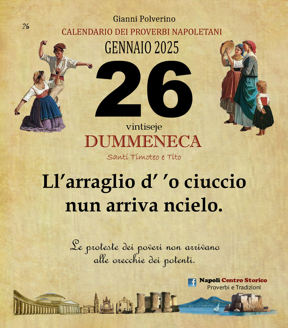 ‘O PRUVERBIO D’ ‘O JUORNO. Domenica 26 gennaio 2025 26/01/2025 binews.it EVIDENZA, Il Proverbio del Giorno 0 di Gianni PolverinoLl’arraglio d’ ’o ciuccio nun arriva ncielo.Le proteste dei poveri non arrivano alle orecchie dei potenti.