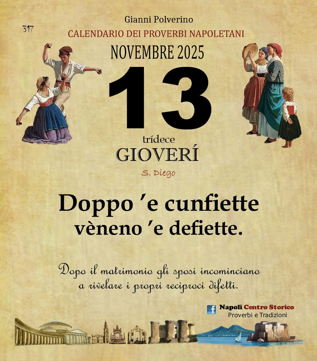 ‘O PRUVERBIO D’ ‘O JUORNO. Giovedì 13 novembre 2025 13/11/2025 binews.it EVIDENZA, Il Proverbio del Giorno 0 di Gianni PolverinoDoppo ’e cunfiette vèneno ’e defiette. Dopo il matrimonio gli sposi incominciano a rivelare i propri reciproci difetti.