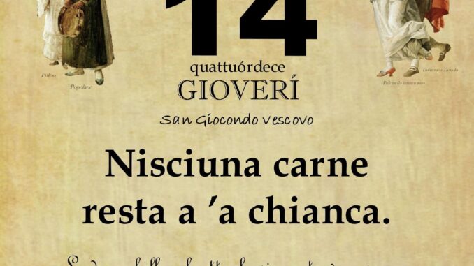 ‘O PRUVERBIO D’ ‘O JUORNO. Giovedì 14 novembre 2024 14/11/2024 binews.it EVIDENZA, Il Proverbio del Giorno 0 di Gianni Polverino Nisciuna carne resta a ’a chianca. Le donne belle o brutte che siano, trovano sempre un adeguata sistemazione.
