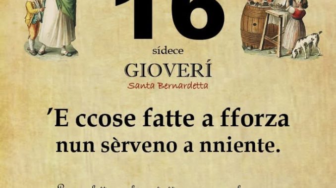 ‘O PRUVERBIO D’ ‘O JUORNO. Giovedì 16 aprile 2026 16/04/2026 binews.it EVIDENZA, Il Proverbio del Giorno 0 di Gianni Polverino ’E ccose fatte a fforza nun sèrveno a nniente. Le cose fatte perchè costretti non riescono bene e non comportano alcun merito o demerito per chi le compie.