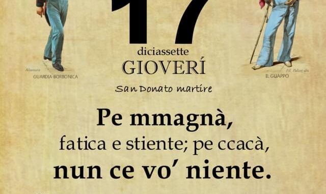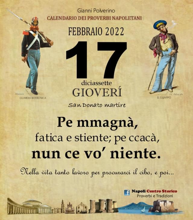 ‘O PRUVERBIO D’ ‘O JUORNO. Giovedì 17 febbraio 2022 17/02/2022 binews.it EVIDENZA, Il Proverbio del Giorno 0 di Gianni PolverinoPe mmagnà, fatica e stiente; pe ccacà, nun ce vo’ niente. Nella vita tanto lavoro per procurarci il cibo, e poi…