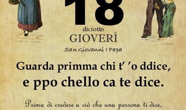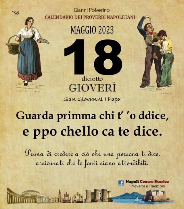 ‘O PRUVERBIO D’ ‘O JUORNO. Giovedì 18 maggio 2023 18/05/2023 binews.it EVIDENZA, Il Proverbio del Giorno 0 di Gianni Polverino Guarda primma chi t’ ’o ddice, e ppo chello ca te dice. Prima di credere a ciò che una persona ti dice, assicurati che le fonti siano attendibili.