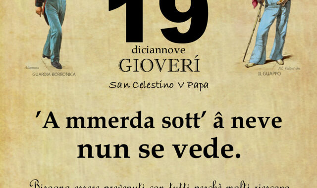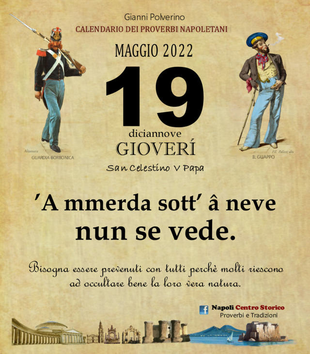 ‘O PRUVERBIO D’ ‘O JUORNO. Giovedì 19 maggio 2022 19/05/2022 binews.it EVIDENZA, Il Proverbio del Giorno 0 di Gianni Polverino ’A mmerda sott’ â neve nun se vede. Bisogna essere prevenuti con tutti perchè molti riescono ad occultare bene la loro vera natura.