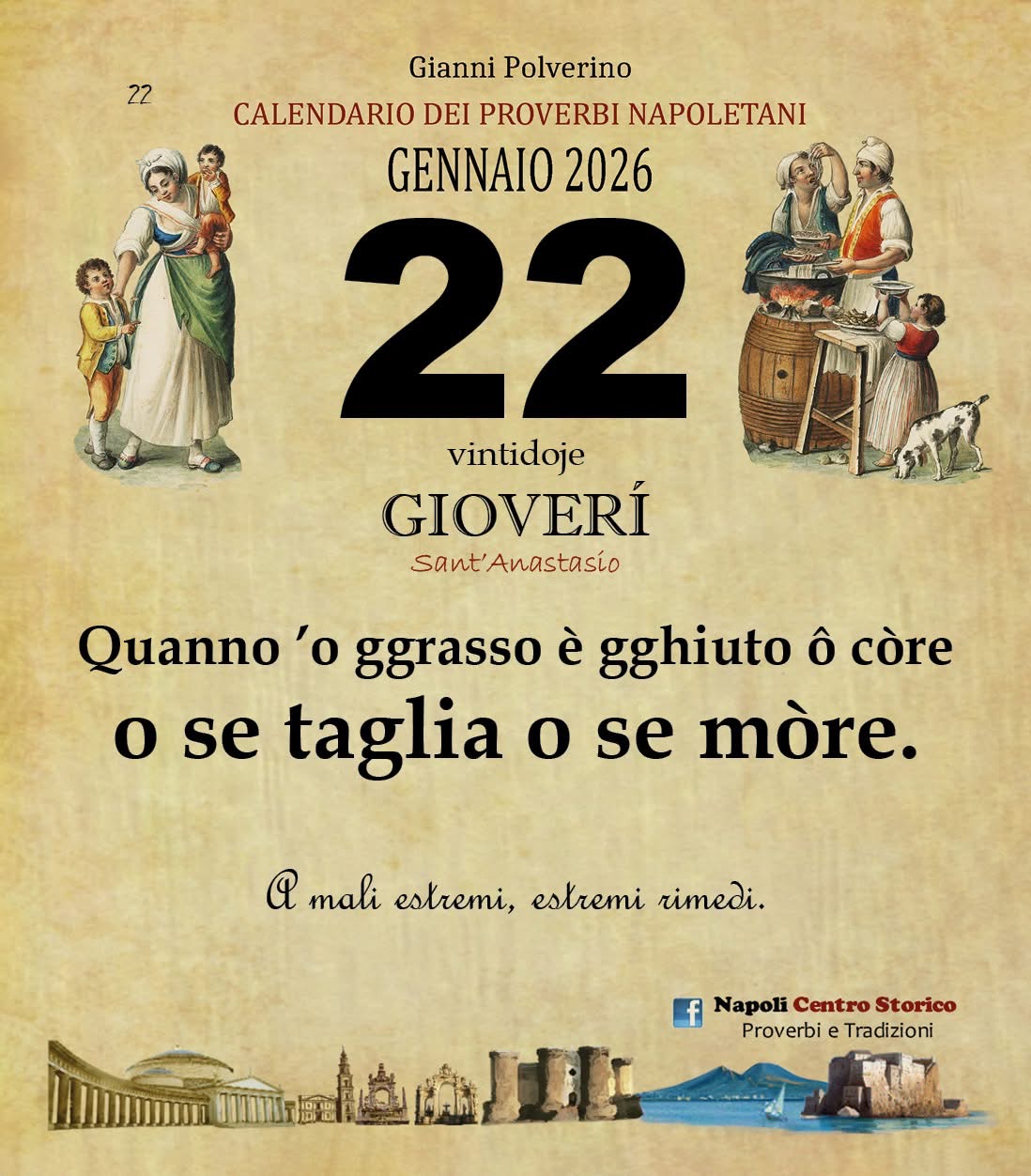 ‘O PRUVERBIO D’ ‘O JUORNO. Giovedì 22 gennaio 2026 22/01/2026 binews.it EVIDENZA, Il Proverbio del Giorno 0 di Gianni Polverino Quanno ’o ggrasso è gghiuto ô còre o se taglia o se mòre. A mali estremi, estremi rimedi.