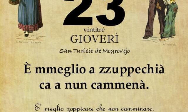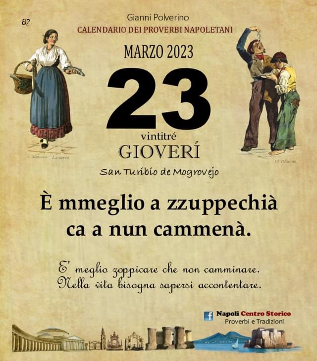 ‘O PRUVERBIO D’ ‘O JUORNO. Giovedì 23 marzo 2023 23/03/2023 binews.it EVIDENZA, Il Proverbio del Giorno 0 di Gianni Polverino È mmeglio a zzuppechià ca a nun cammenà. E’ meglio zoppicare che non camminare. Nella vita bisogna sapersi accontentare.