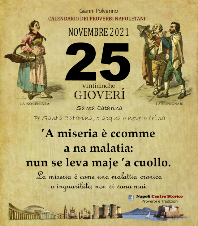 ‘O PRUVERBIO D’ ‘O JUORNO. Giovedì 25 novembre 2021 25/11/2021 binews.it EVIDENZA, Il Proverbio del Giorno 0 di Gianni Polverino ’A miseria è ccomme a na malatia: nun se leva maje ’a cuollo. La miseria è come una malattia cronica o inguaribile; non si sana mai.