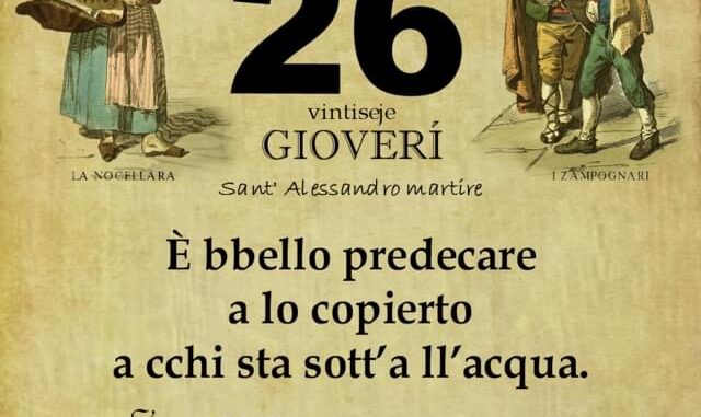 ‘O PRUVERBIO D’ ‘O JUORNO. Giovedi 26 agosto 2021 26/08/2021 binews.it EVIDENZA, Il Proverbio del Giorno 0 di Gianni Polverino È bbello predecare a lo copierto a cchi sta sott’a ll’acqua. E’ comodo atteggiarsi a maestri quando non si hanno problemi.