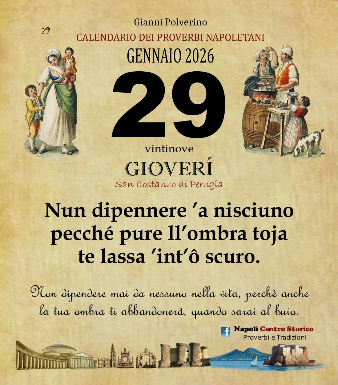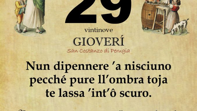 ‘O PRUVERBIO D’ ‘O JUORNO. Giovedi 29 gennaio 2026 29/01/2026 binews.it EVIDENZA, Il Proverbio del Giorno 0 di Gianni PolverinoNun dipennere ’a nisciuno pecché pure ll’ombra toja te lassa ’int’ô scuro.Non dipendere mai da nessuno nella vita, perchè anche la tua ombra ti abbandonerà, quando sarai al buio.