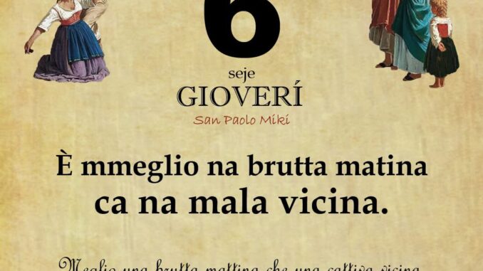 ‘O PRUVERBIO D’ ‘O JUORNO. Giovedì 6 febbraio 2025 06/02/2025 binews.it EVIDENZA, Il Proverbio del Giorno 0 di Gianni Polverino È mmeglio na brutta matina ca na mala vicina Meglio una brutta mattina che una cattiva vicina. La prima passa, l’altra resta.
