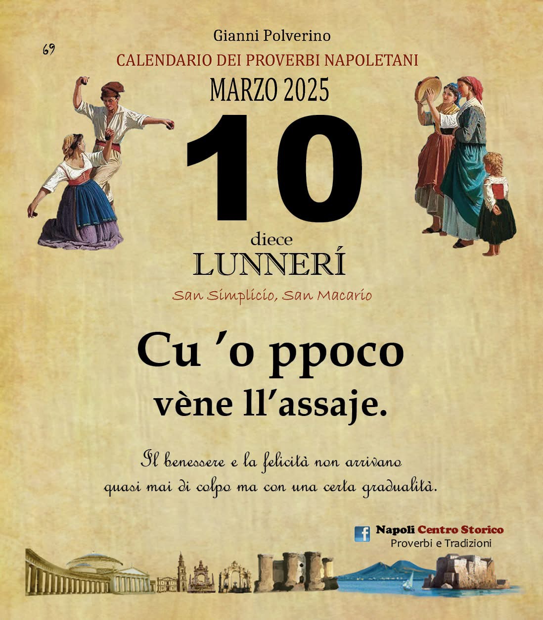 ‘O PRUVERBIO D’ ‘O JUORNO. Lunedì 10 marzo 2025 10/03/2025 binews.it EVIDENZA, Il Proverbio del Giorno 0 di Gianni Polverino Cu ’o ppoco vène ll’assaje. Il benessere e la felicità non arrivano quasi mai di colpo ma con una certa gradualità.