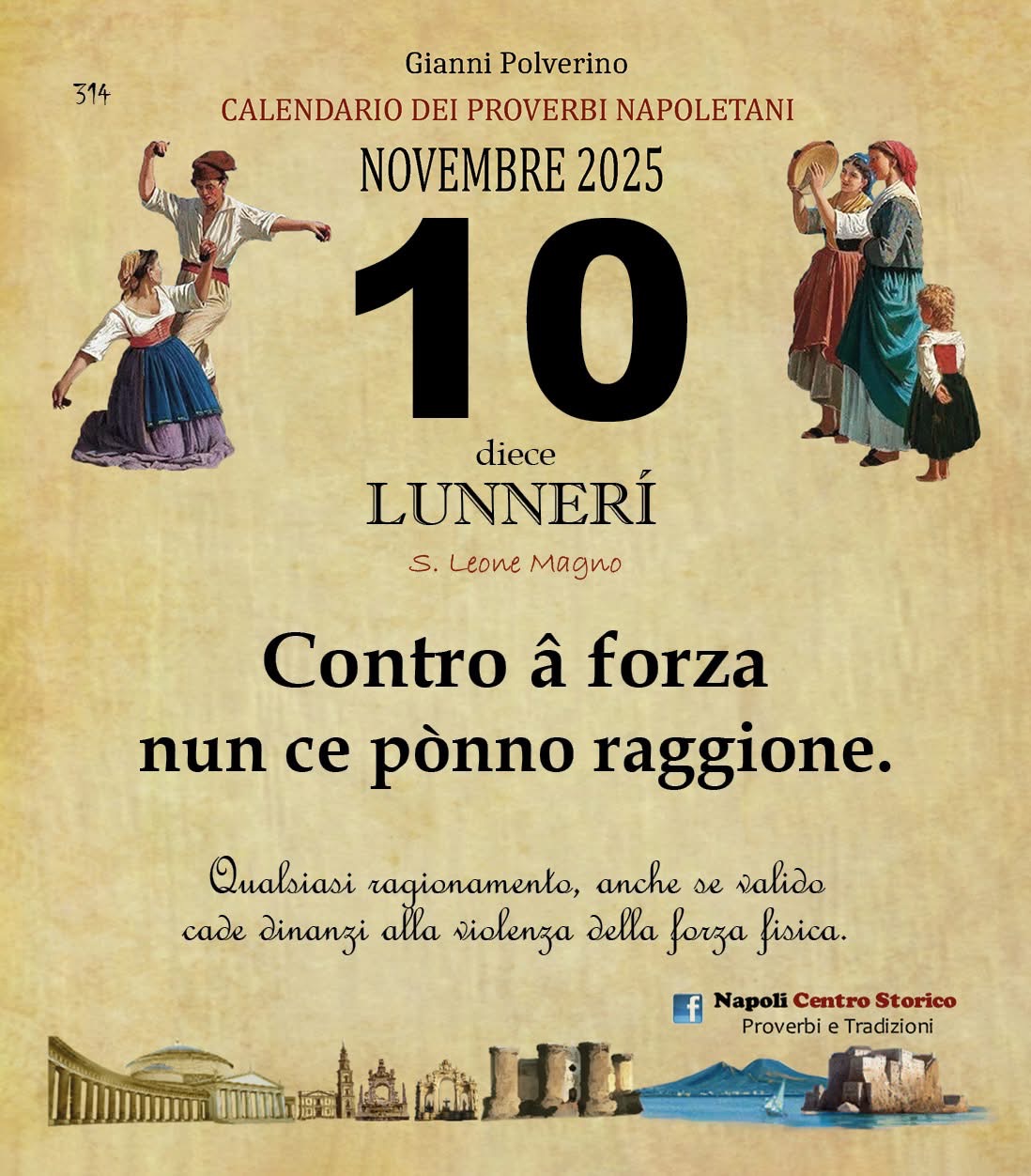 ‘O PRUVERBIO D’ ‘O JUORNO. Lunedì 10 novembre 2025 10/11/2025 binews.it EVIDENZA, Il Proverbio del Giorno 0 di Gianni PolverinoContro â forza nun ce pònno raggione. Qualsiasi ragionamento, anche se valido cade dinanzi alla violenza della forza fisica.