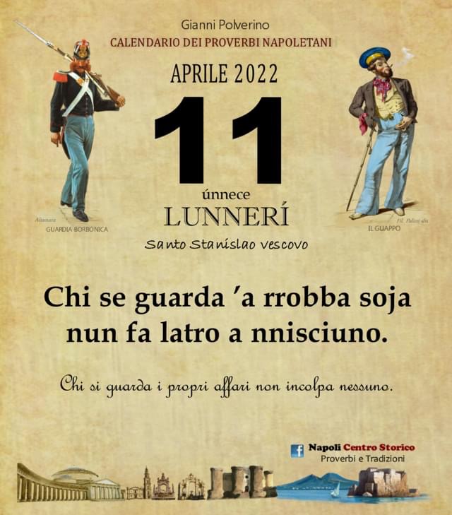 ‘O PRUVERBIO D’ ‘O JUORNO. Lunedì 11 aprile 2022 11/04/2022 binews.it EVIDENZA, Il Proverbio del Giorno 0 di Gianni PolverinoChi se guarda ’a rrobba soja nun fa latro a nnisciuno. Chi si guarda i propri affari non incolpa nessuno.