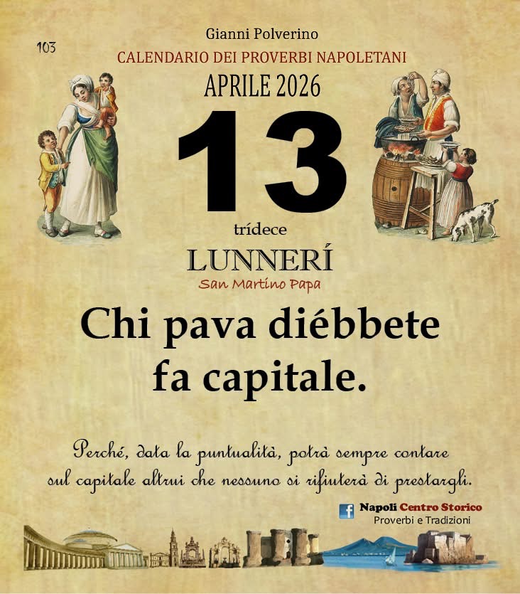 ‘O PRUVERBIO D’ ‘O JUORNO. Lunedì 13 aprile 2026 13/04/2026 binews.it EVIDENZA, Il Proverbio del Giorno 0 di Gianni Polverino Chi pava diébbete fa capitale. Perché, data la puntualità, potrà sempre contare sul capitale altrui che nessuno si rifiuterà di prestargli.