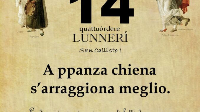 ‘O PRUVERBIO D’ ‘O JUORNO. Lunedì 14 ottobre 2024 14/10/2024 binews.it EVIDENZA, Il Proverbio del Giorno 0 di Gianni PolverinoA ppanza chiena s’arraggiona meglio.Le discussioni o i ragionamenti fatti dopo pranzo sono più chiari e costruttivi.