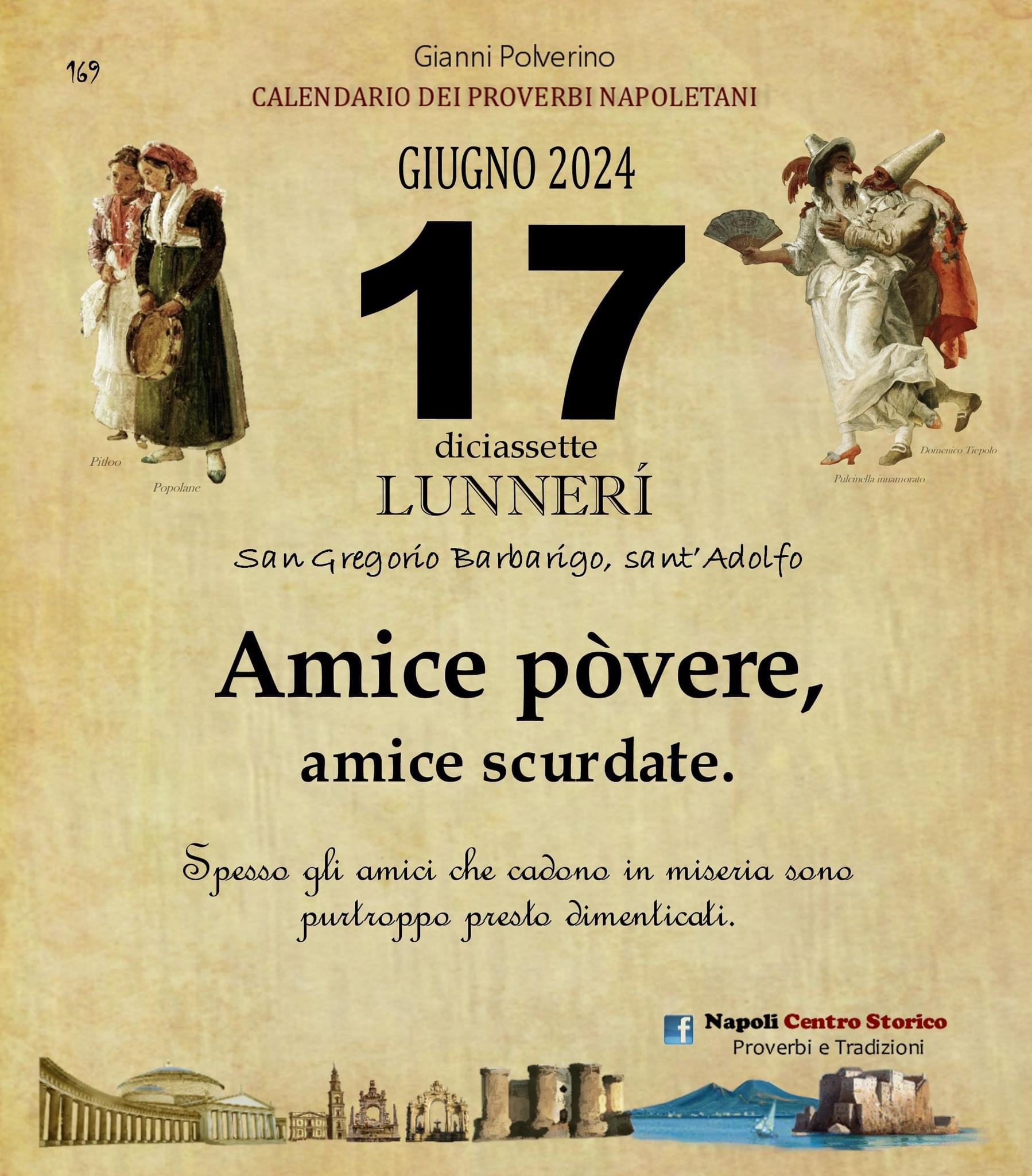 ‘O PRUVERBIO D’ ‘O JUORNO. Lunedì 17 giugno 2024 17/06/2024 binews.it EVIDENZA, Il Proverbio del Giorno 0 di Gianni Polverino Amice pòvere, amice scurdate. Spesso gli amici che cadono in miseria sono purtroppo presto dimenticati.