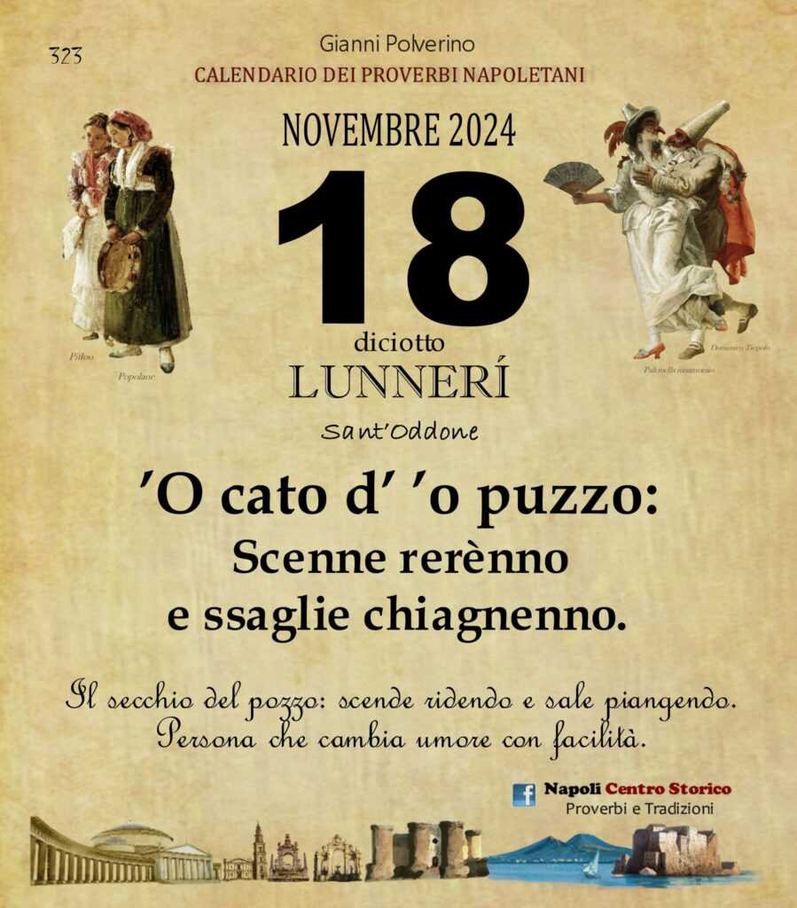 ‘O PRUVERBIO D’ ‘O JUORNO . Lunedì 18 novembre 2024 18/11/2024 binews.it EVIDENZA, Il Proverbio del Giorno 0 di Gianni Polverino ’O cato d’ ’o puzzo: Scenne rerènno e ssaglie chiagnenno. Il secchio del pozzo: scende ridendo e sale piangendo. Persona che cambia umore con facilità.