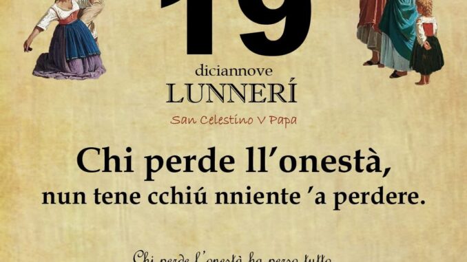 ‘O PRUVERBIO D’ ‘O JUORNO. Lunedì 19 maggio 2025 19/05/2025 binews.it EVIDENZA, Il Proverbio del Giorno 0 di Gianni Polverino Chi perde ll’onestà, nun tene cchiú nniente ’a perdere. Chi perde l’onestà ha perso tutto.