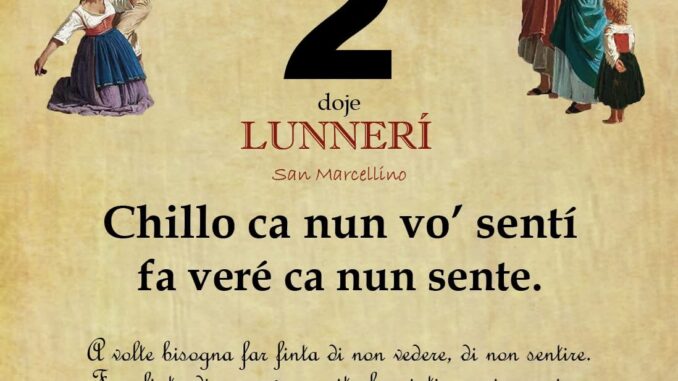 ‘O PRUVERBIO D’ ‘O JUORNO. Lunedì 2 giugno 2025 02/06/2025 binews.it EVIDENZA, Il Proverbio del Giorno 0 di Gianni Polverino Chillo ca nun vo’ sentí fa veré ca nun sente. A volte bisogna far finta di non vedere, di non sentire. Fare finta di non aver capito frecciatine e risparmiare fiato in risposta a delle frasi inutili e stupide.