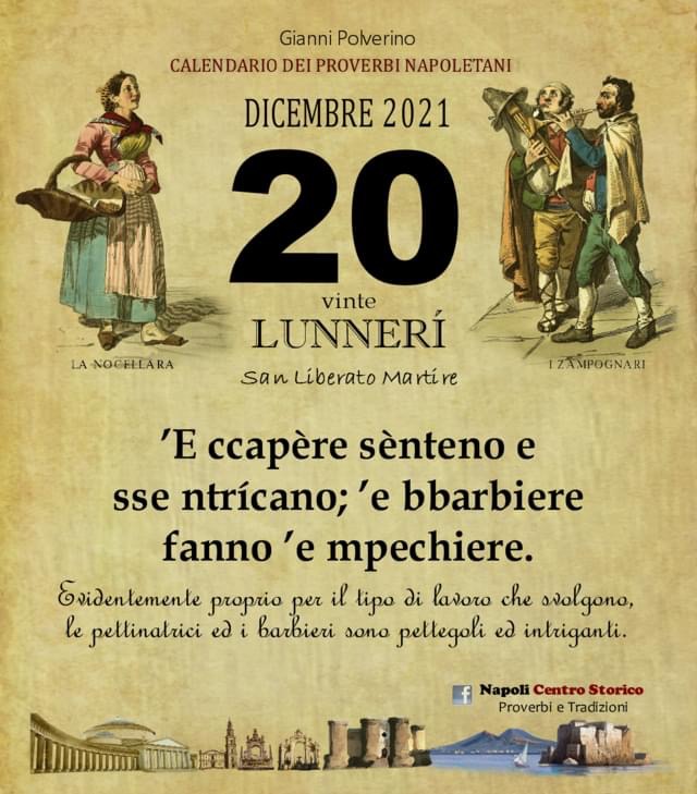 ‘O PRUVERBIO D’ ‘O JUORNO. Lunedì 20 dicembre 2021 20/12/2021 binews.it EVIDENZA, Il Proverbio del Giorno 0 di Gianni Polverino’E ccapère sènteno e sse ntrícano; ’e bbarbiere fanno ’e mpechiere. Evidentemente proprio per il tipo di lavoro che svolgono, le pettinatrici ed i barbieri sono pettegoli ed intriganti.